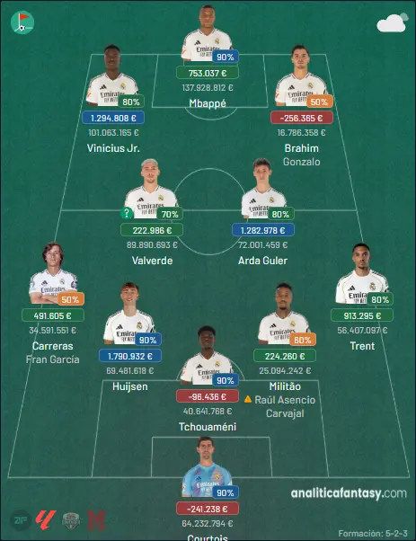 En subida de precio destacan: Huijsen (+1.79M€), Vinícius Jr. (+1.29M€), Arda Güler (+1.28M€), Trent (+913K€) y Mbappé (+753K€).
