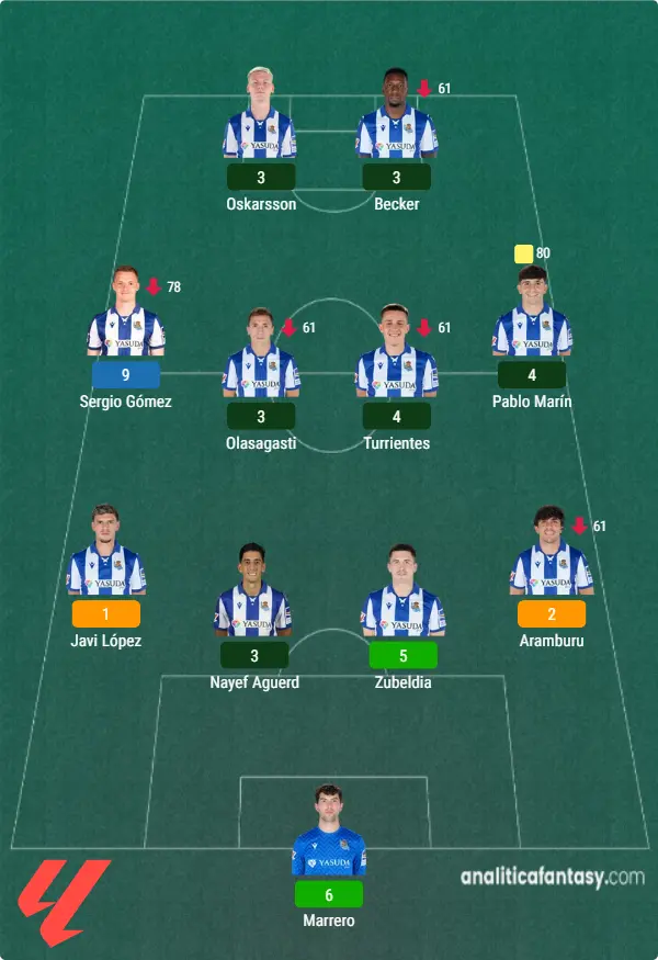 ✅ Titulares permanentes: Marrero, Aguerd, Zubeldia, Javi López, Pablo Marín y Oskarsson