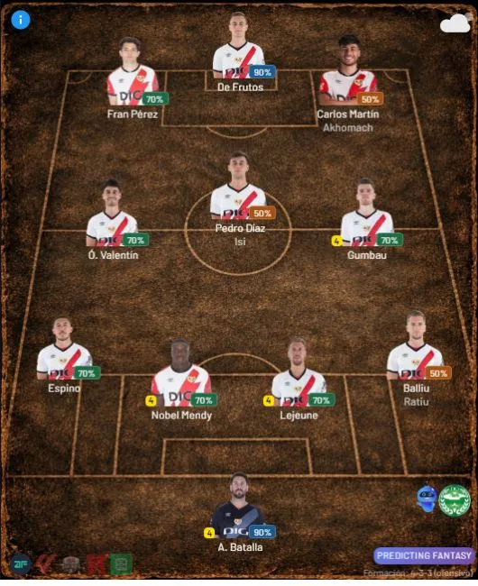 El equipo franjirrojo encarriló este jueves la eliminatoria frente al Samsunspor con un 1-3 en la ida: Alemão marcó dos goles y Álvaro García completó el triunfo. Para ese partido, el técnico eligió de inicio a Batalla; Ratiu, Luiz Felipe, Lejeune, Pep Chavarría; Unai López, Pathé Ciss; Isi Palazón, Ilias Akhomach, Álvaro García; y Alemão.