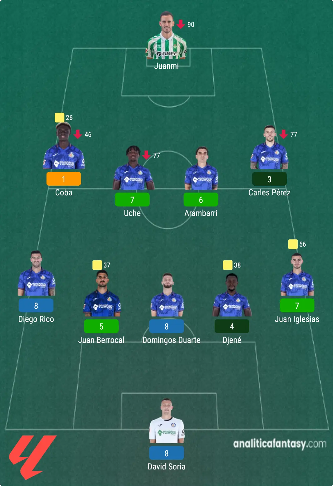 ↩ Titulares cambiados: Coba (46), Carles Pérez y Uche (77), Juanmi (91)