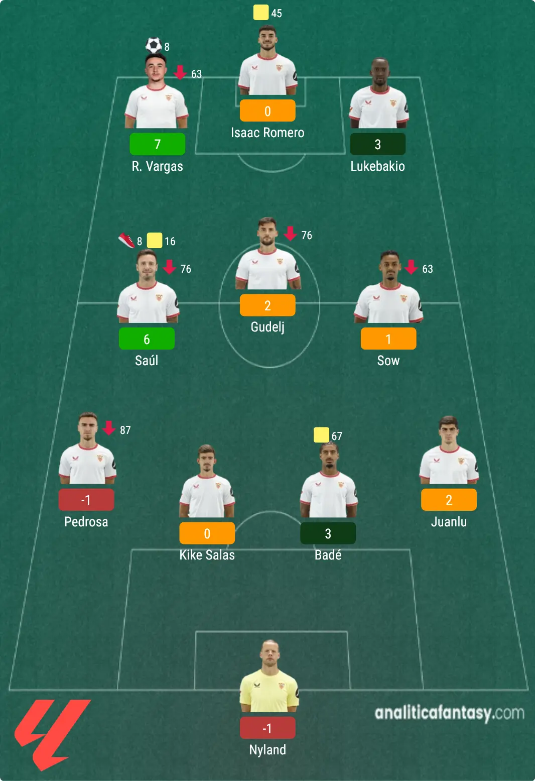 ↩ Titulares cambiados: Sow y Vargas (63), Gudelj y Saúl (76), Pedrosa (87)